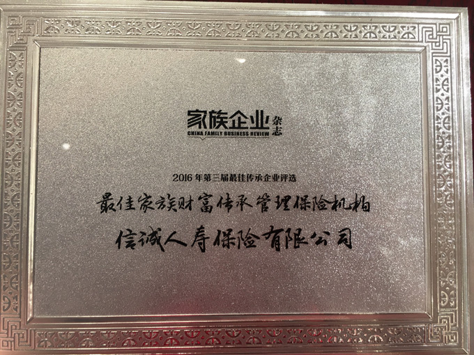 经过组委会的专业评选,信诚人寿因“2014年推出国内首个高净值人士专属保险品牌—传家,并联合中信信托创新推出保险金信托服务”荣获“最佳家族财富传承管理保险机构”殊荣。