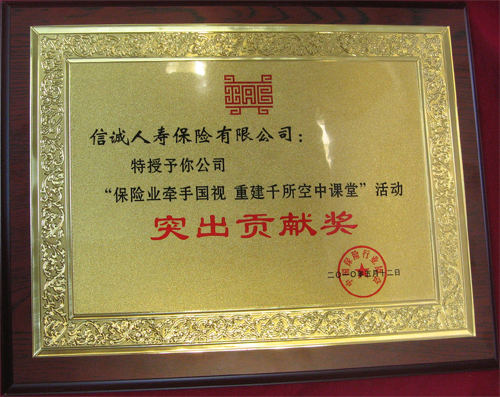 5月12日,汶川地震发生两周年,中国保险行业协会在北京举办会议,为对汶川震灾援助过程中做出贡献的保险企业进行隆重表彰。因先后向地震灾区累计捐赠500套,总价值225万元的空中课堂设备,信诚人寿荣获行业协会特别颁发的“保险业牵手国视 重建千所‘空中课堂’”活动突出贡献奖。