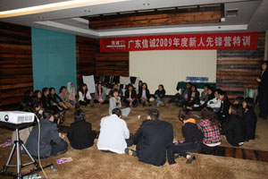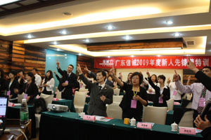 2010年3月24日至25日,信诚人寿广东省分公司在清远佛冈森波拉度假村举办了2009年度新人先锋营特训。来自信诚人寿广东各机构09新人先锋营达标者参加了本次培训活动。信诚人寿广东省分公司总经理郑少玮先生和营销业务主管陈艳女士亲临现场并担任授课导师。郑总与各位新人分享其专属秘笈课程“天下第一至宝”及“信诚百万成功路——七年规划”,让到场的伙伴获益良多,信心倍增;特训营还特别设置了明星照拍摄、触动心灵的烛光晚会以及别开生面的团队建设活动,让新人怀着感恩之心,拥有无比勇气,迎难而上,迎接未来挑战,努力拼搏实现在特训营中订立的2010年目标。