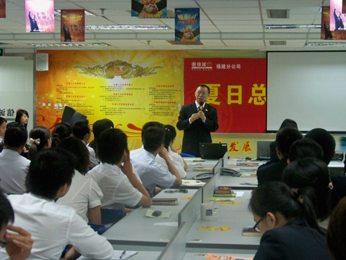 (福建分公司总经理田洪兰正与伙伴们分享他的亲身感受)