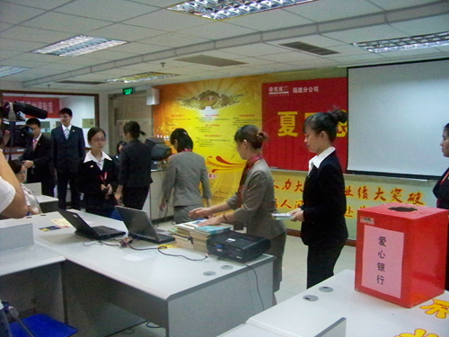 为了让贫困山区的儿童能够读到好书,响应总公司号召,2009年9月18日,福建分公司在联合大早会上举行了简单但温馨的捐书启动仪式。此次联合大早会显得格外隆重,分公司全体内外勤以及银保客户经理都参加了此次大早会。