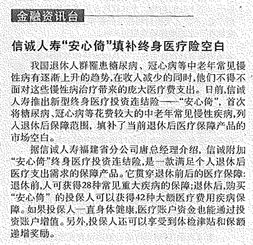 信诚人寿“安心倚”填补终身医疗险空白