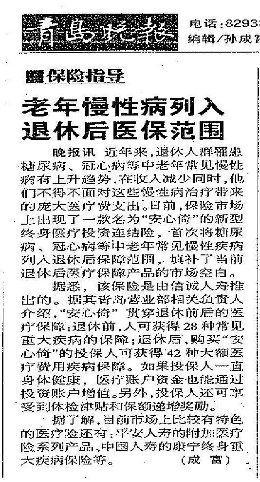 公司动态-老年慢性病列入退休后医保范围(青岛晚报)