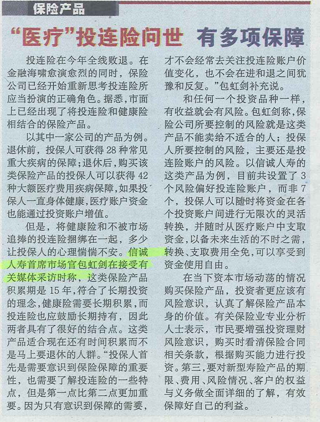 投资快报——医疗投连险问世