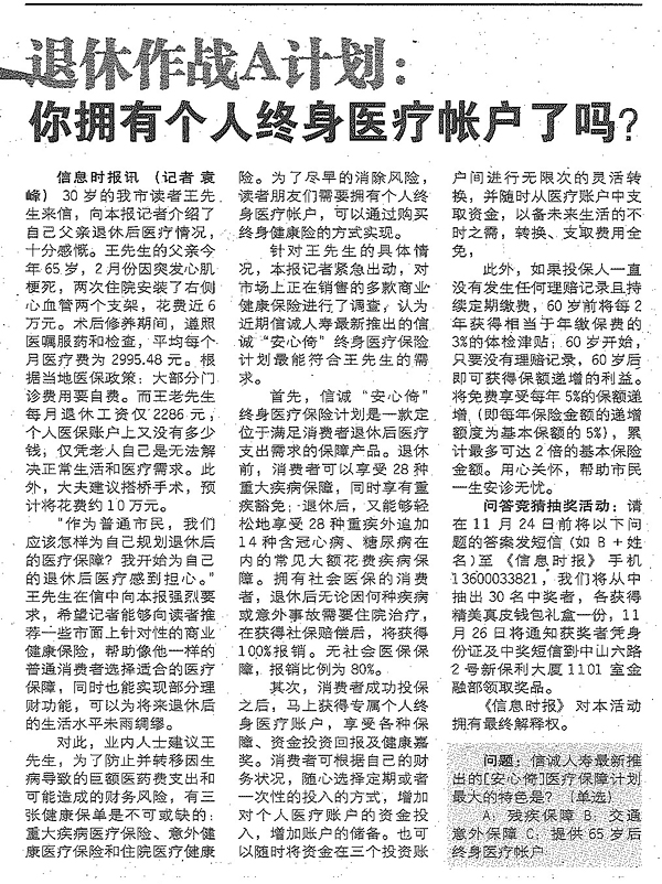 信息时报——退休作战A计划:你拥有个人终身医疗帐户了吗?