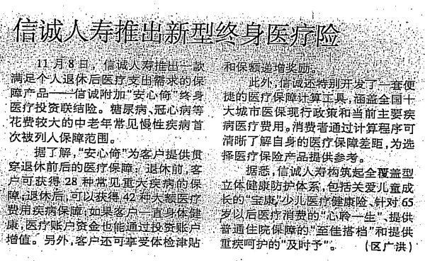 深圳商报——信诚人寿推出新型终身医疗险