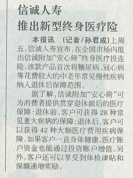 南方日报——信诚人寿推出新型终身医疗险