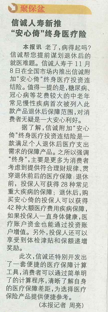 羊城地铁报——信诚人寿新推“安心倚”终身医疗险