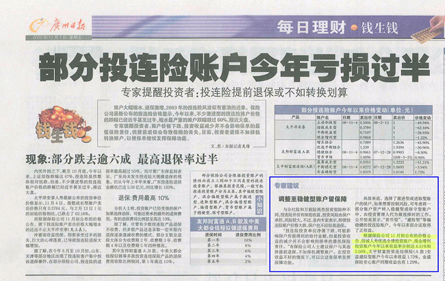 广州日报——部分投连险账户今年亏损过半,调整至稳健型账户留保障