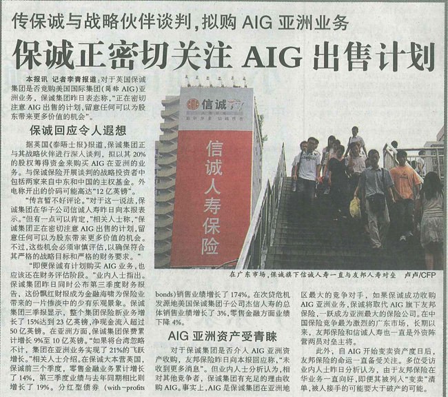 羊城晚报——保诚正密切关注AIG的出售计划