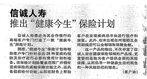 下一篇:深圳特区报——信诚为高端客户推出“健康今生”保险计划