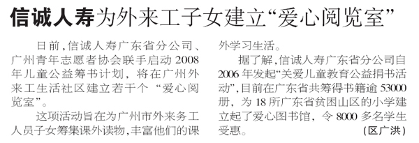深圳商报—信诚人寿为外来工子女建立“爱心阅览室”