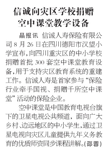 晶报——信诚向灾区学校捐赠空中课堂教学设备