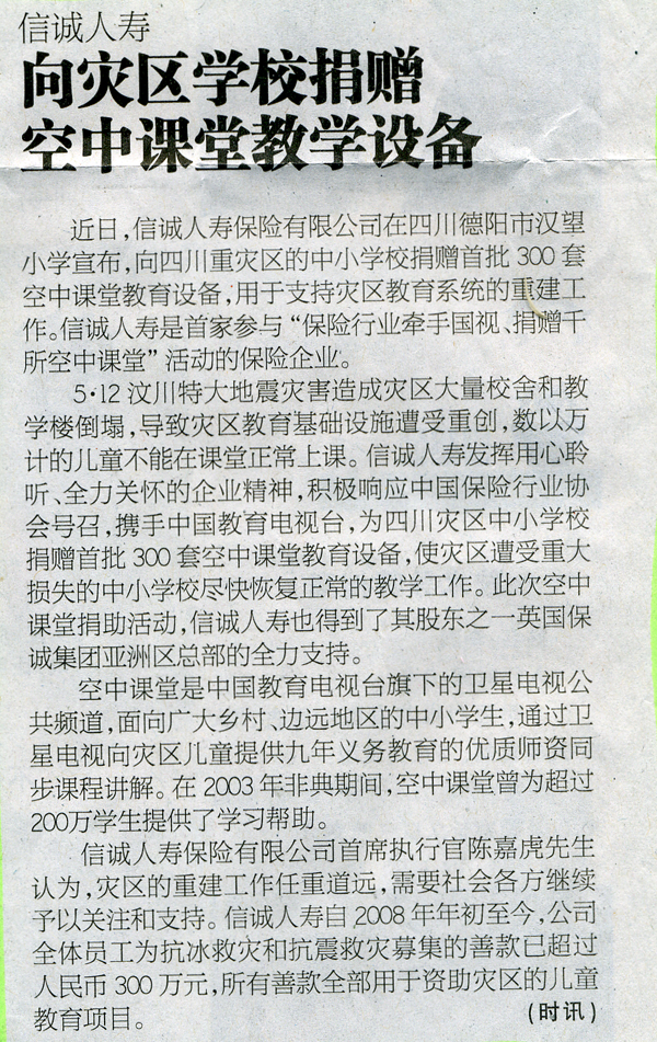 珠江时报——信诚人寿向灾区学校捐赠空中课堂教学设备
