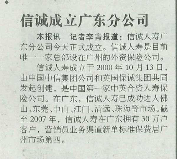 羊城晚报——信诚成立广东分公司