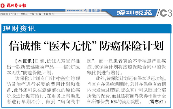 深圳特区报——信诚推“医本无忧”防癌保险计划