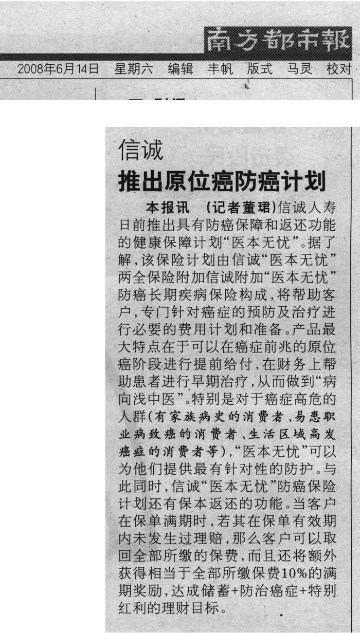 下一篇:珠江时报——信诚人寿推出“医本无忧”防癌保险计划