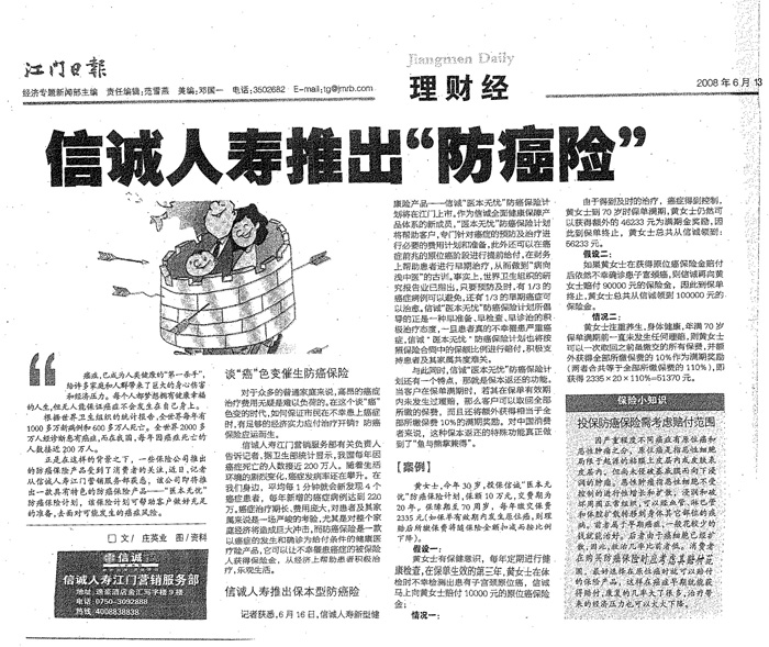 江门日报——信诚人寿推出“防癌险”