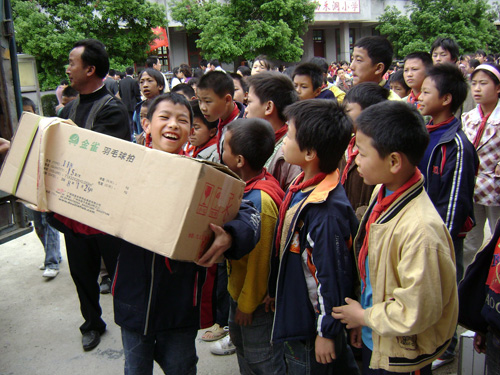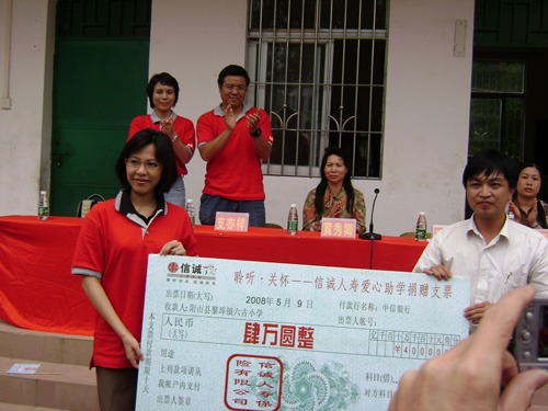 2008年5月8—9日,信诚人寿广州地区和清远营销服务部的员工和营销员代表将满载爱心价值15万元的资金和物资亲自送往连山县禾洞中心小学、太保镇山口小学以及阳山县黎埠镇六古小学等学校。这些资金和物资将全部用于受灾损毁的校舍和相关基础设施的重建。