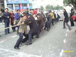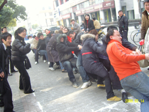 早上10时,露天比赛现场,顶着寒风,一声哨响,拉开了比赛序幕,比赛双方队员握紧绳子,身体向后倾,拼命向自己的方向拽绳子,绳中间的红绸带往左往右牵动着众人的心。一轮比赛下来,大家感出关键所在了,原先西装革履的男士、脚蹬细高跟鞋的女士宛然另一幅风范:西装甩了、皮鞋换运动鞋了、蹲位低了、身子向后倾了、腮帮子鼓起了、憋着一股气了;拉拉队员沸腾了,一 二 三,加油声汇成一股流了,全体人员进入状态了···最后鲲鹏团队以绝对优势稳夺冠、星辰团队获得亚军。