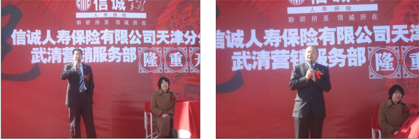 欢乐的锣鼓声拉开了庆典的序幕,信诚人寿天津分公司总经理齐彤先生、天津分公司营销业务渠道部主管姜宏维先生、天津分公司业务发展部王桂发经理及武清营销服务部负责人张亚娟经理先后在开幕仪式上致辞,公司领导对静海的发展寄予了厚望。相信武清营销服务部在信诚经营理念的指导下,一定能立足市场、扎根武清,成为武清寿险市场上理财及保障方案的最佳提供者,并将信诚的创新理念和创新产品带入武清。