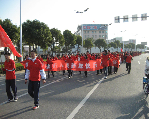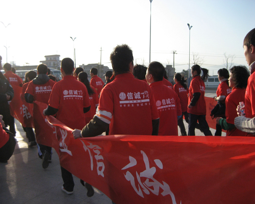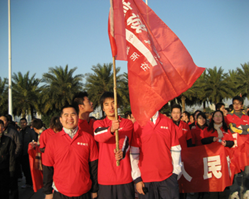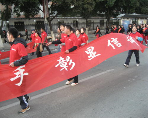 7点刚过,一百多支由各企事业单位组成的方队按事先安排好的位置就位。队伍前竖立着各色“战旗”,寒风中的旗手一脸肃然。参加活动的企事业单位几乎囊括了温州所有的支柱产业。其中信诚人寿温州营销服务部的同仁们,也以饱满的精神面貌在市民面前亮相。红色的条幅和红色T恤上的信诚logo格外醒目,在整个活动方阵里就像一团团燃烧的火焰,那一团团燃烧的火焰汇聚着我们每一位温州信诚人沸腾的热血和激情……