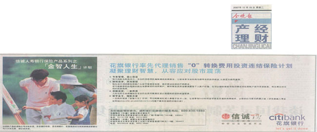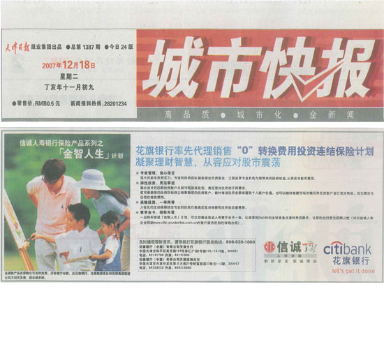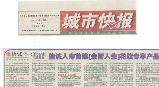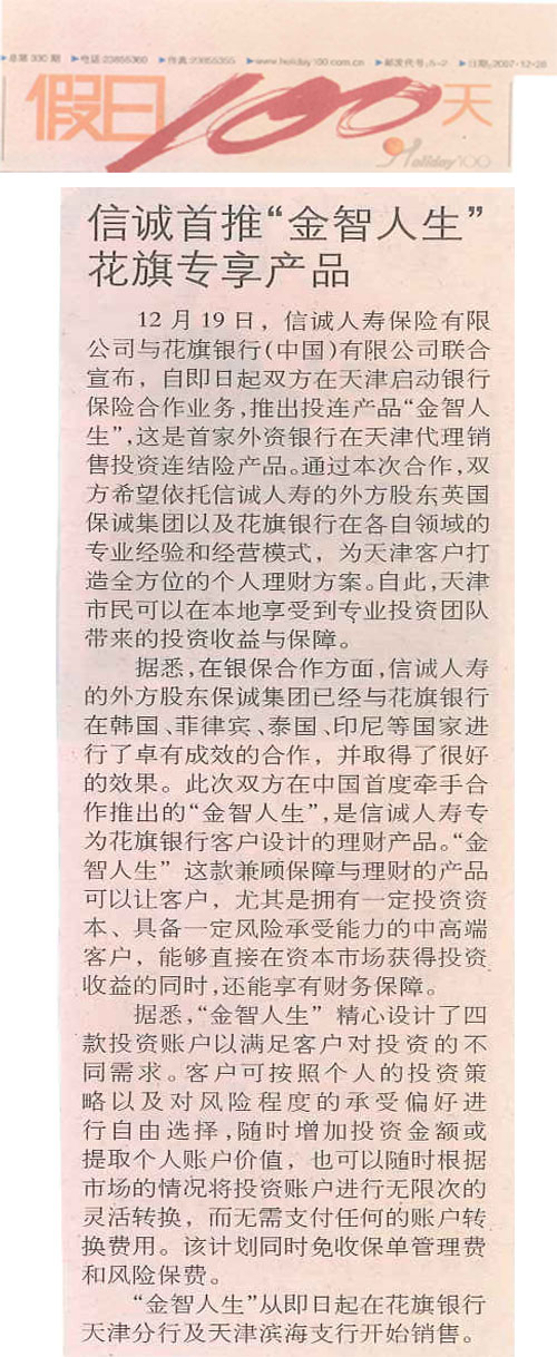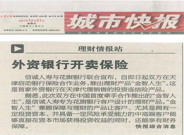 信诚人寿首推(金智人生)花旗专享产品--信诚人寿与花旗银行合作在天津启动银行保险合作业务