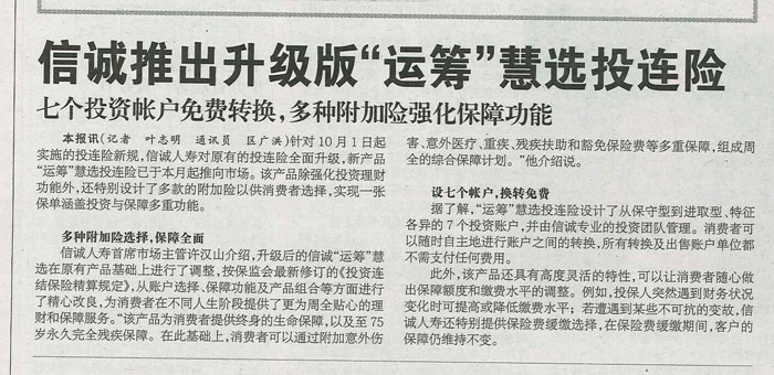 投资快报——信诚推出升级版“运筹”慧选投连险