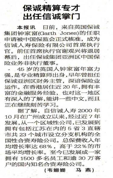 保诚精算专才出任信诚掌门