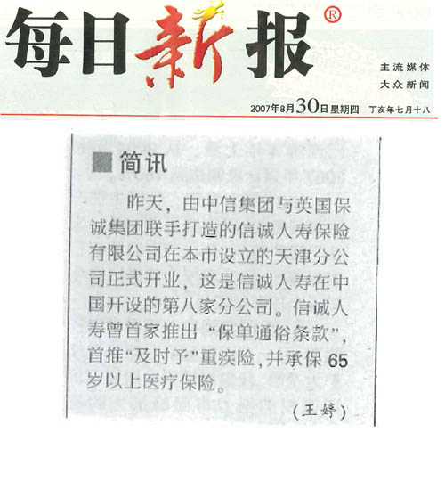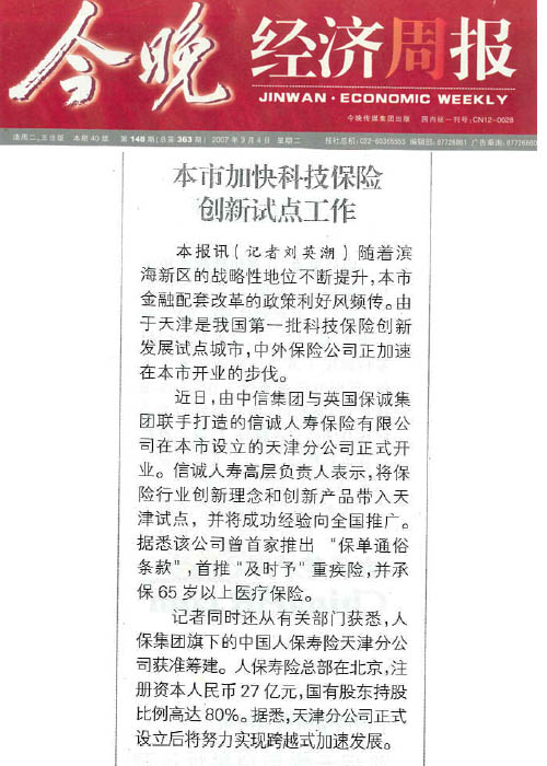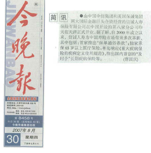 在天津正式开业,中信集团、保诚集团及信诚高层领导、天津市政府领导、监管部门、媒体及社会各界人士近