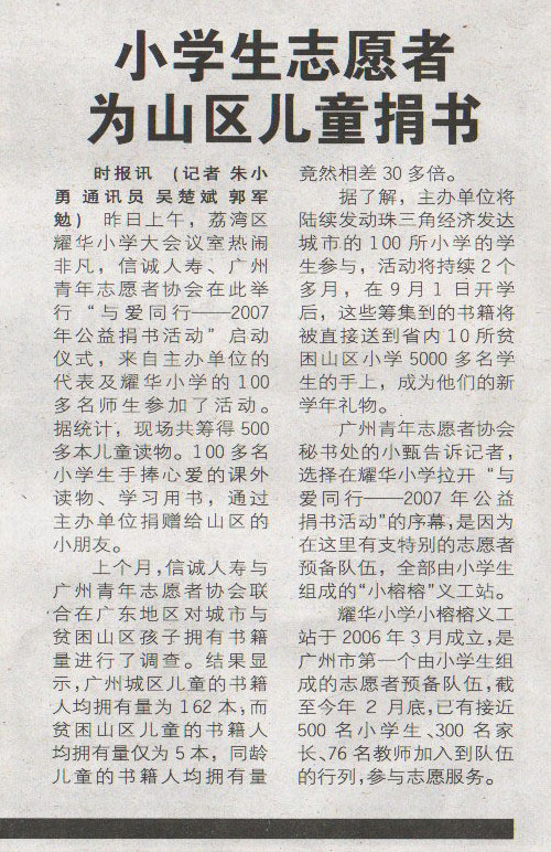 信息时报——小学生志愿者为山区儿童捐书