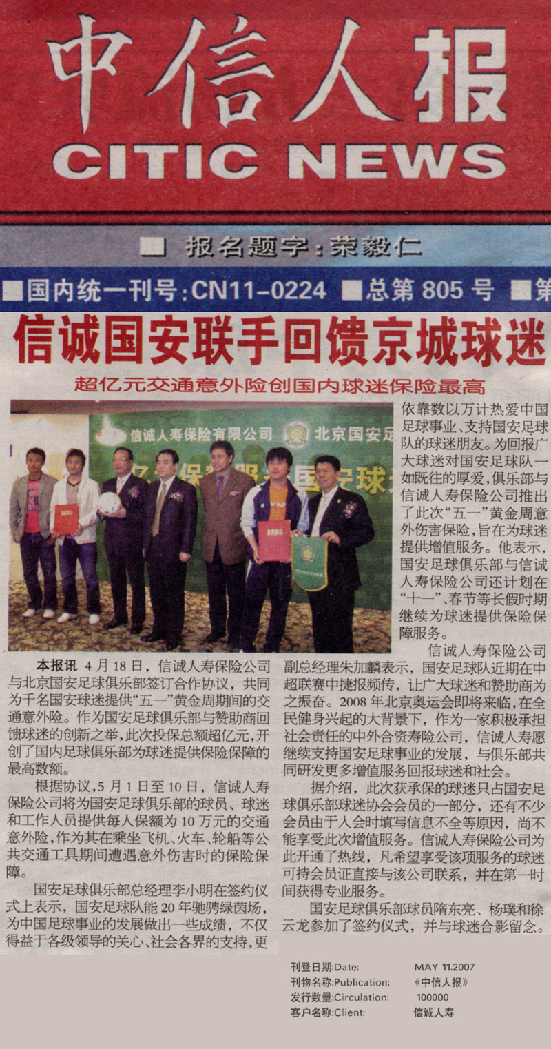 信诚国安联手回馈京城球迷