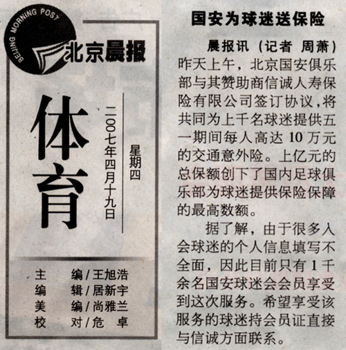 国安为球迷送保险