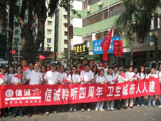 为此,一向关注广州环境保护、热心公益事业的“信诚人寿”,举办了本次“信诚聆听四周年、卫生城市人人建”的大型公益活动。作为2004年“中国最具发展潜力的5大寿险公司”之一的“信诚人寿”,自2000年捐资60万成立从化信诚希望小学以来,每年都投身各种社会公益活动。这次为支持广州“创卫”,“信诚人寿”特别组织了一支由全体代理人和内勤员工组成的队伍,一起走上广州街头,以拍照记录卫生情况的方式,寻找和举报卫生死角。这是广州市迄今为止为支持创建国家卫生城市而进行的人数最多、最大型的活动。