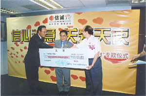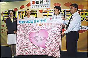 2003年5月28日,为进一步支持抗“非典”前线医护人员的工作,表达全体保险代理人及员工对奋战在抗“非典”最前线的医护人员的关爱,普及防“非典”知识教育,信诚人寿保险有限公司向广州市红十字会捐赠人民币11万多元,并在公司的培训室举行了简单而隆重的捐赠仪式。广州市人大常委会副主任陈传誉先生出席了本次活动,并接收了信诚人寿捐赠的款项和爱心海报。