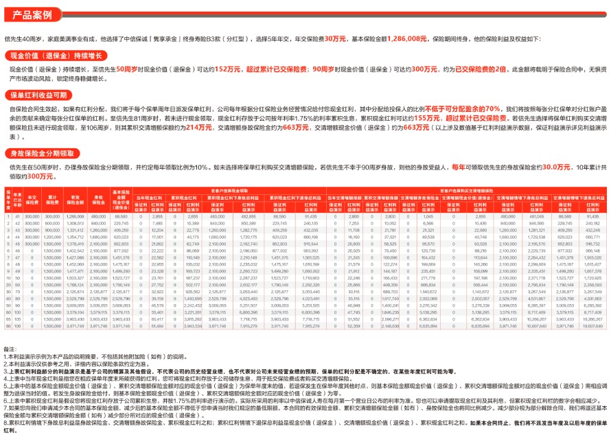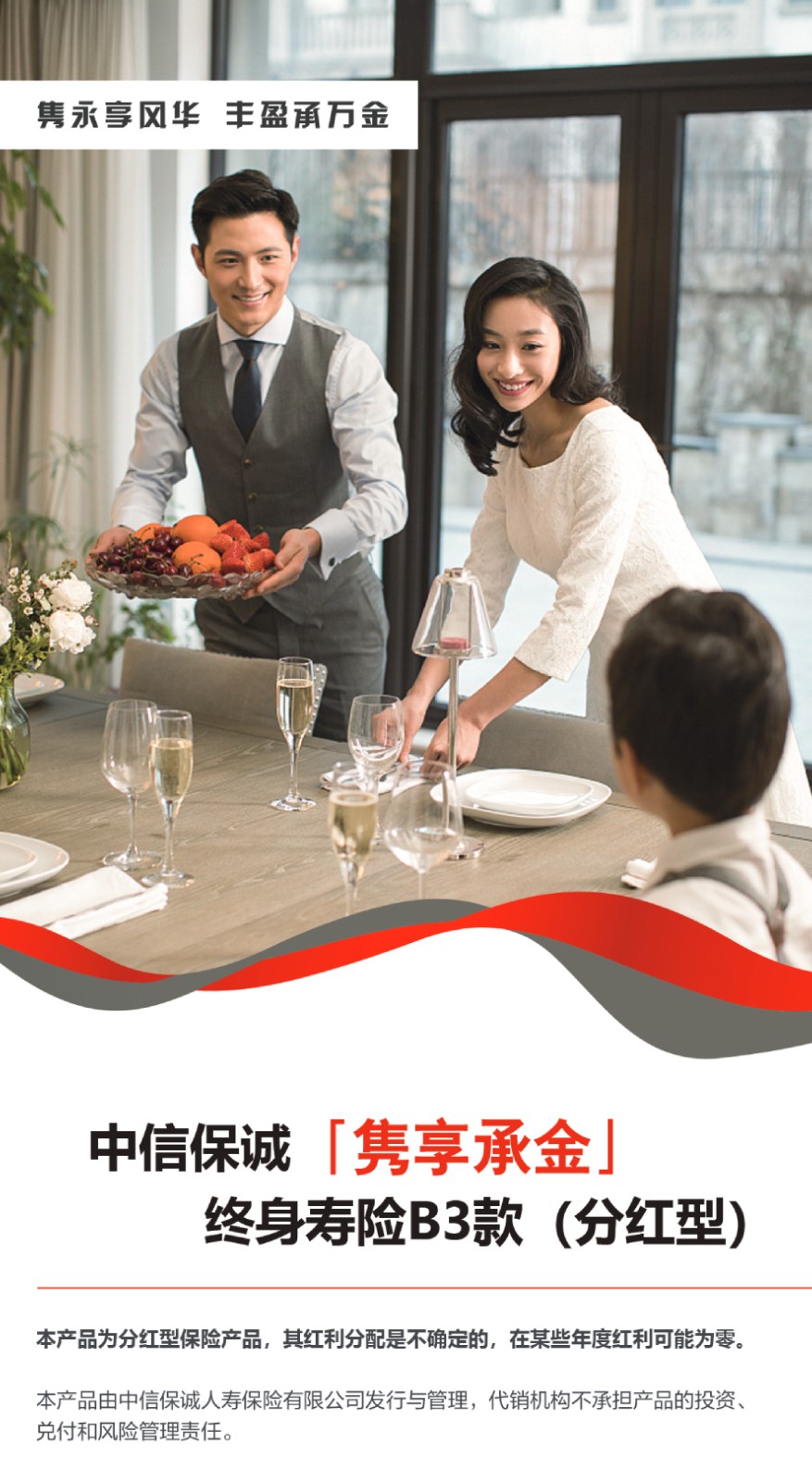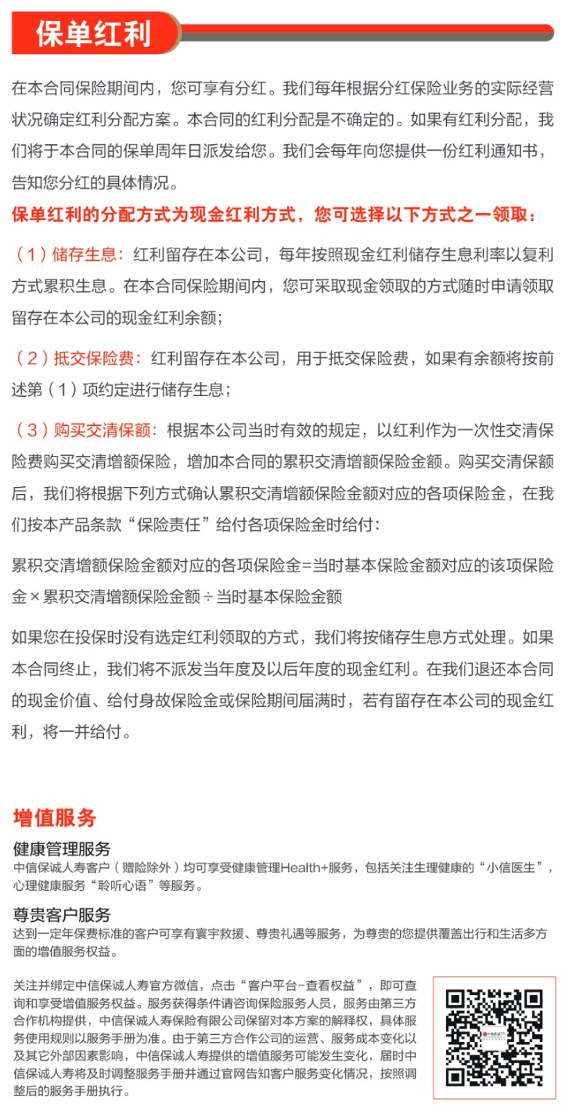 责任免除:在某些情况下,我们不承担保险责任,详细内容见相关保险合同条款。此为产品的简单介绍,仅供参考,详细内容请以保险合同条款为准。相关保险合同条款:中信保诚「隽享承金」终身寿险B3款(分红型)