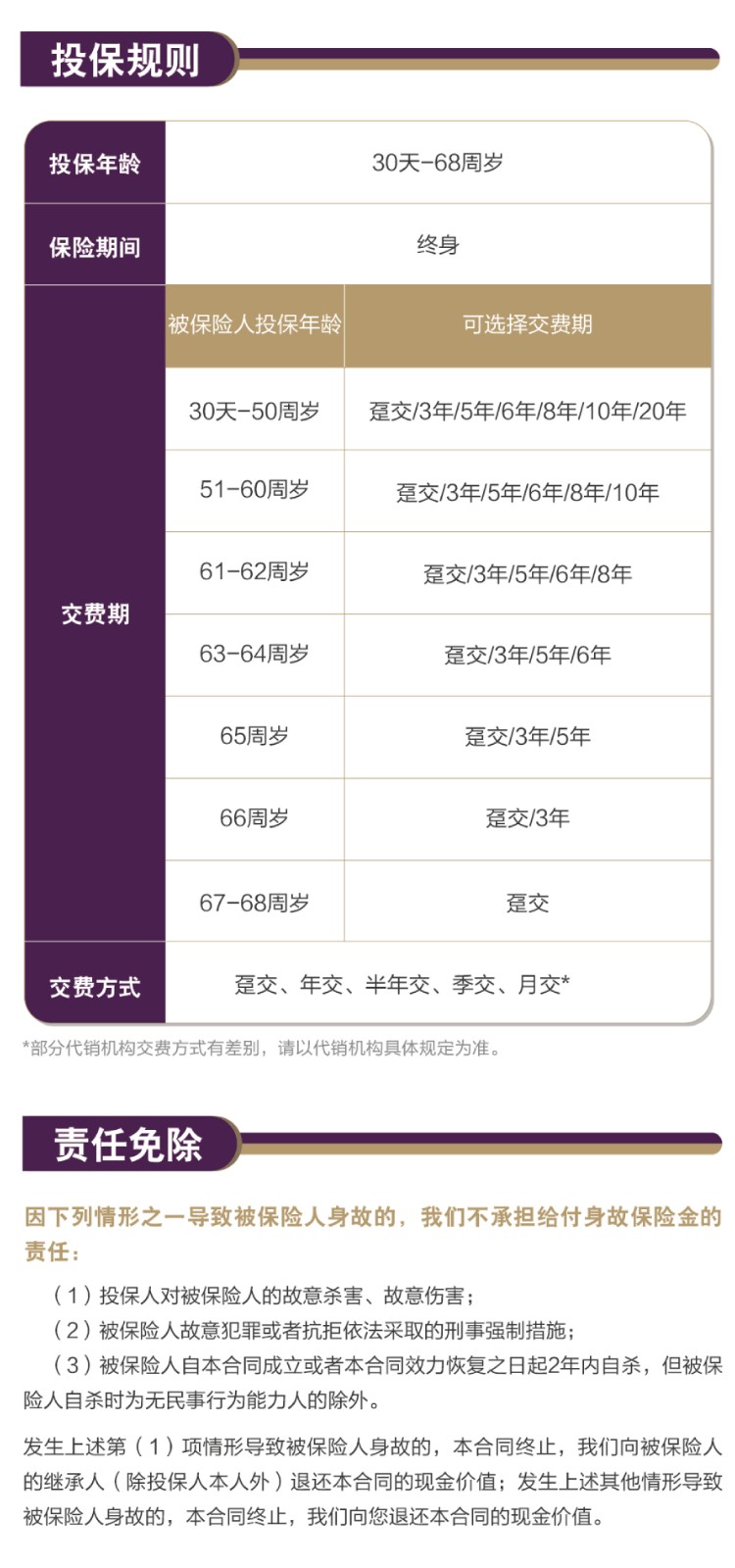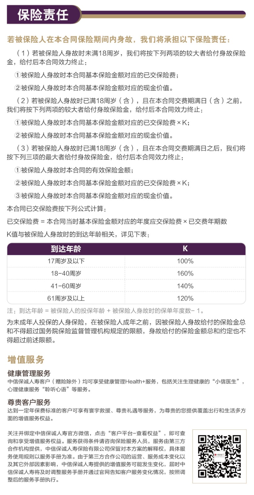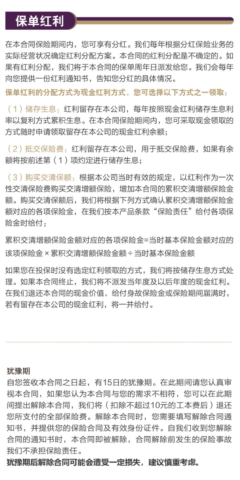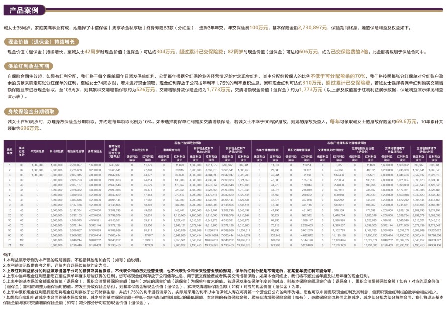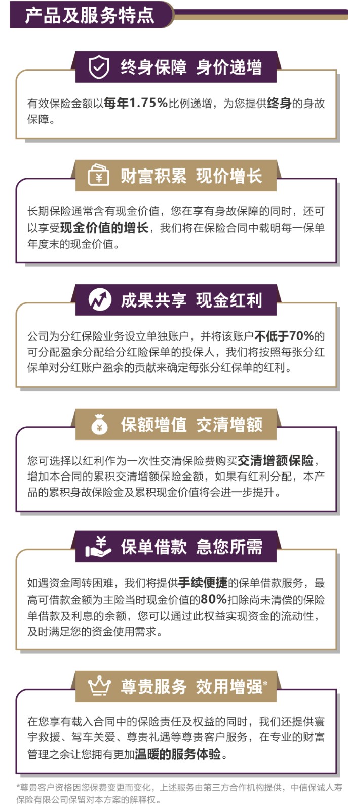 责任免除:在某些情况下,我们不承担保险责任,详细内容见相关保险合同条款。此为产品的简单介绍,仅供参考,详细内容请以保险合同条款为准。相关保险合同条款:中信保诚「隽享承金私享版」终身寿险B3款(分红型)