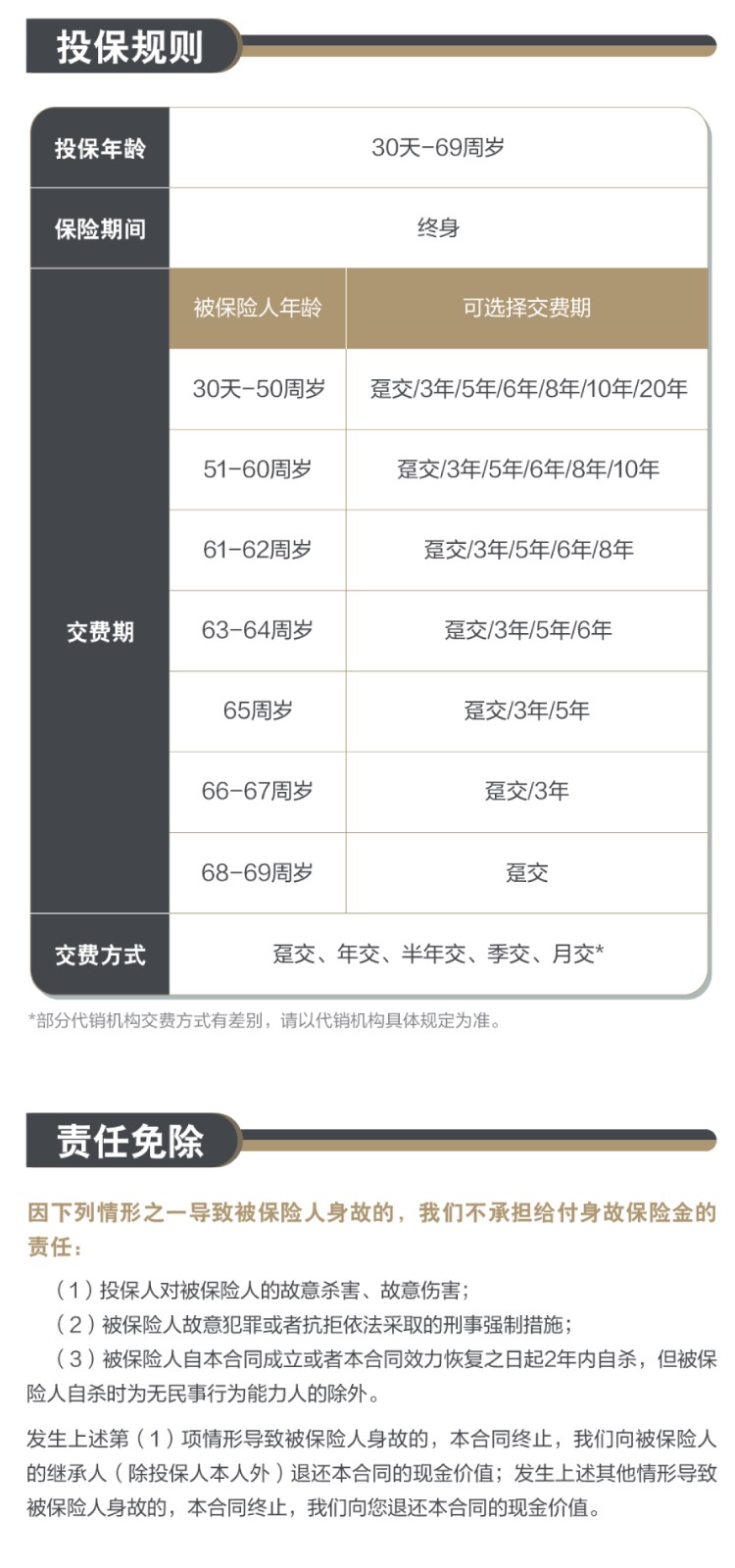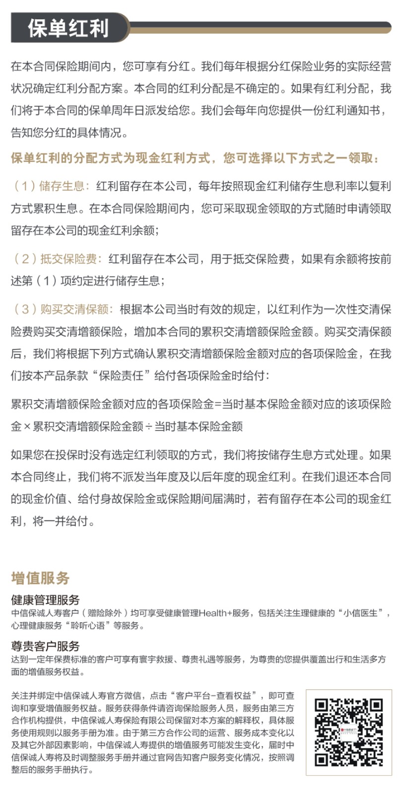 责任免除:在某些情况下,我们不承担保险责任,详细内容见相关保险合同条款。此为产品的简单介绍,仅供参考,详细内容请以保险合同条款为准。相关保险合同条款:中信保诚「隽享承金至尊版」终身寿险B3款(分红型)
