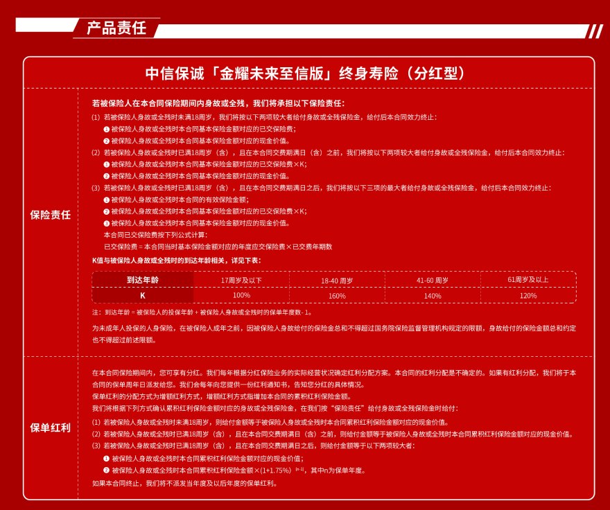 责任免除:在某些情况下,我们不承担保险责任,详细内容见相关保险合同条款。此为产品的简单介绍,仅供参考,详细内容请以保险合同条款为准。相关保险合同条款:中信保诚「金耀未来至信版」终身寿险(分红型)