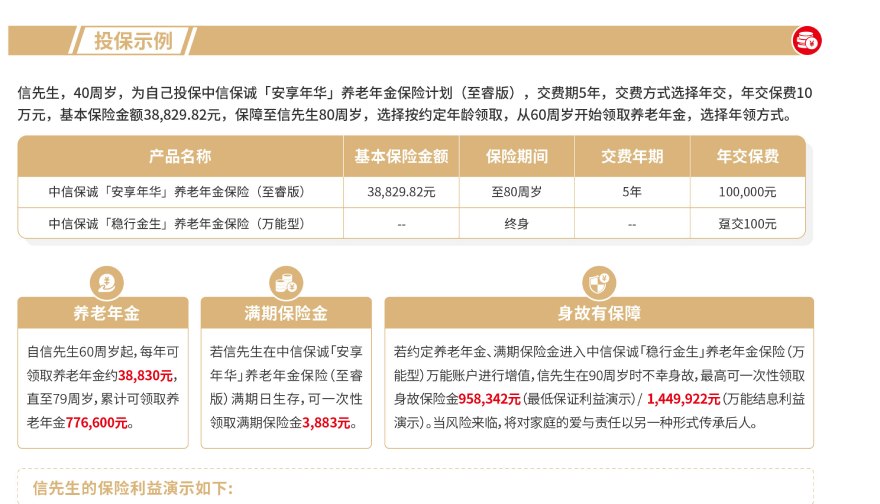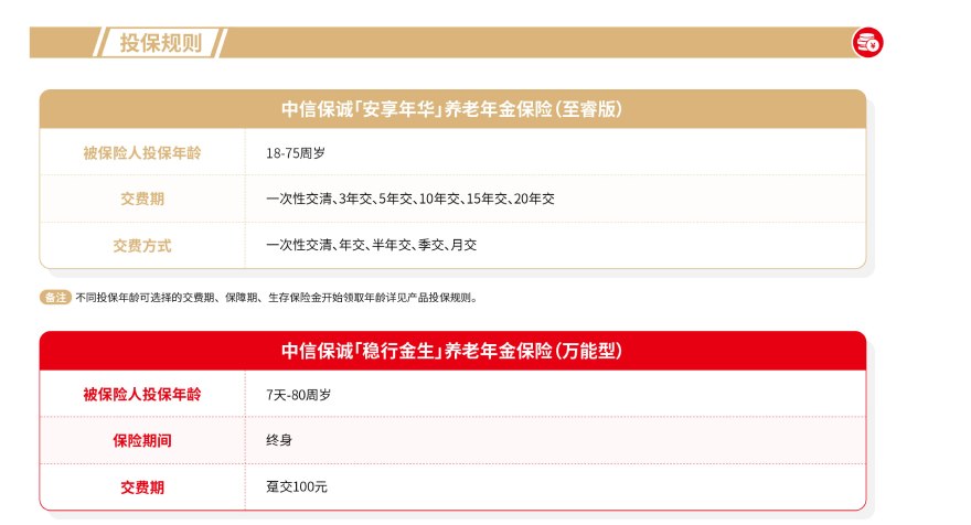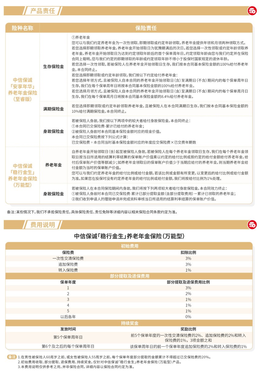 责任免除:在某些情况下,我们不承担保险责任,详细内容见相关保险合同条款。此为产品的简单介绍,仅供参考,详细内容请以保险合同条款为准。相关保险合同条款:中信保诚「安享年华」养老年金保险(至睿版)、中信保诚「稳行金生」养老年金保险(万能型)