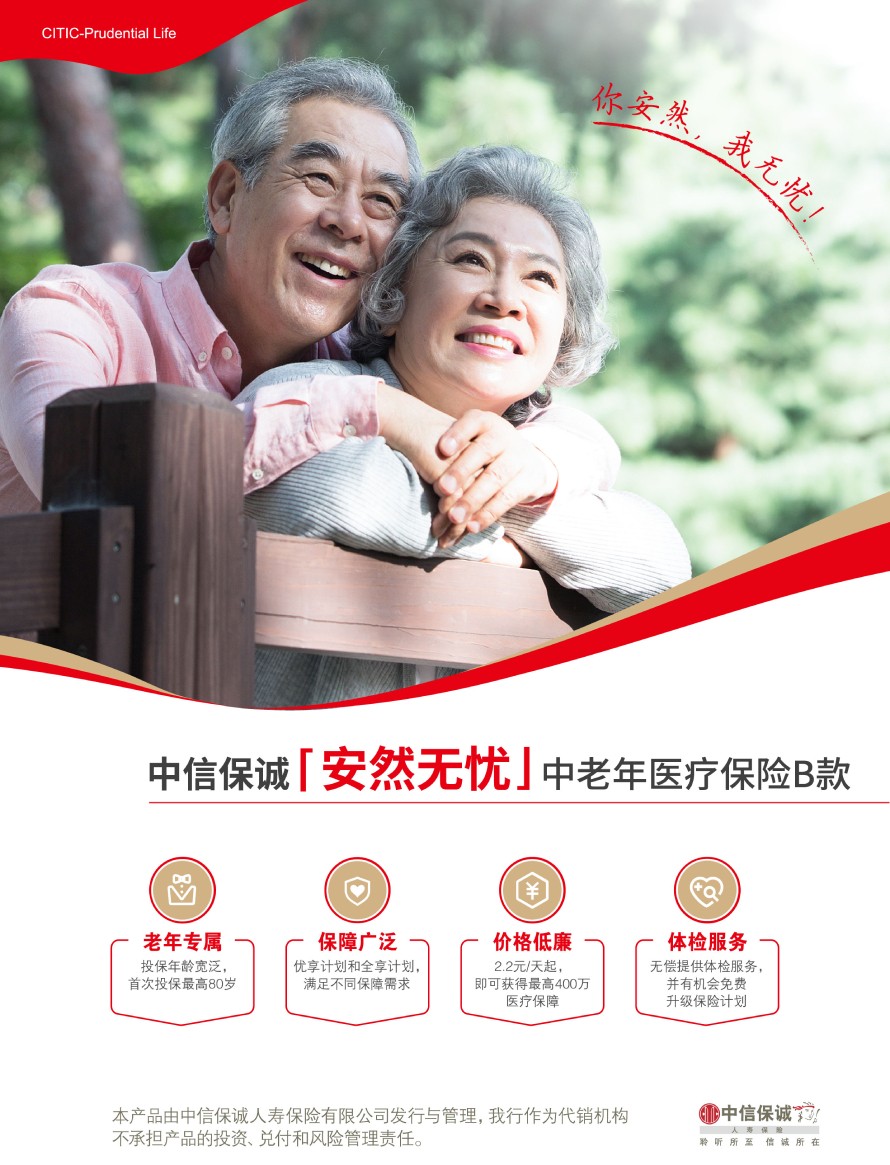 责任免除:在某些情况下,我们不承担保险责任,详细内容见相关保险合同条款。此为产品的简单介绍,仅供参考,详细内容请以保险合同条款为准。相关保险合同条款:中信保诚「安然无忧」中老年医疗保险B款