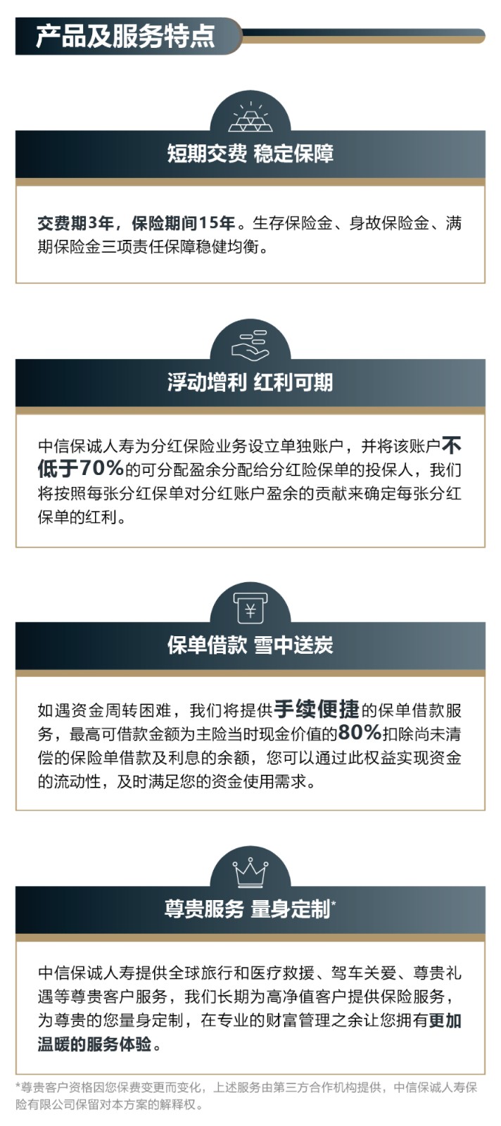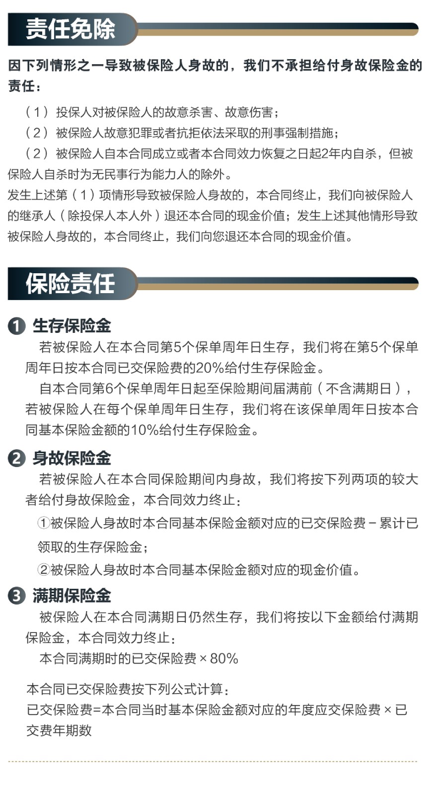 责任免除:在某些情况下,我们不承担保险责任,详细内容见相关保险合同条款。此为产品的简单介绍,仅供参考,详细内容请以保险合同条款为准。相关保险合同条款:中信保诚「隽享鸿利」年金保险B3款(分红型)