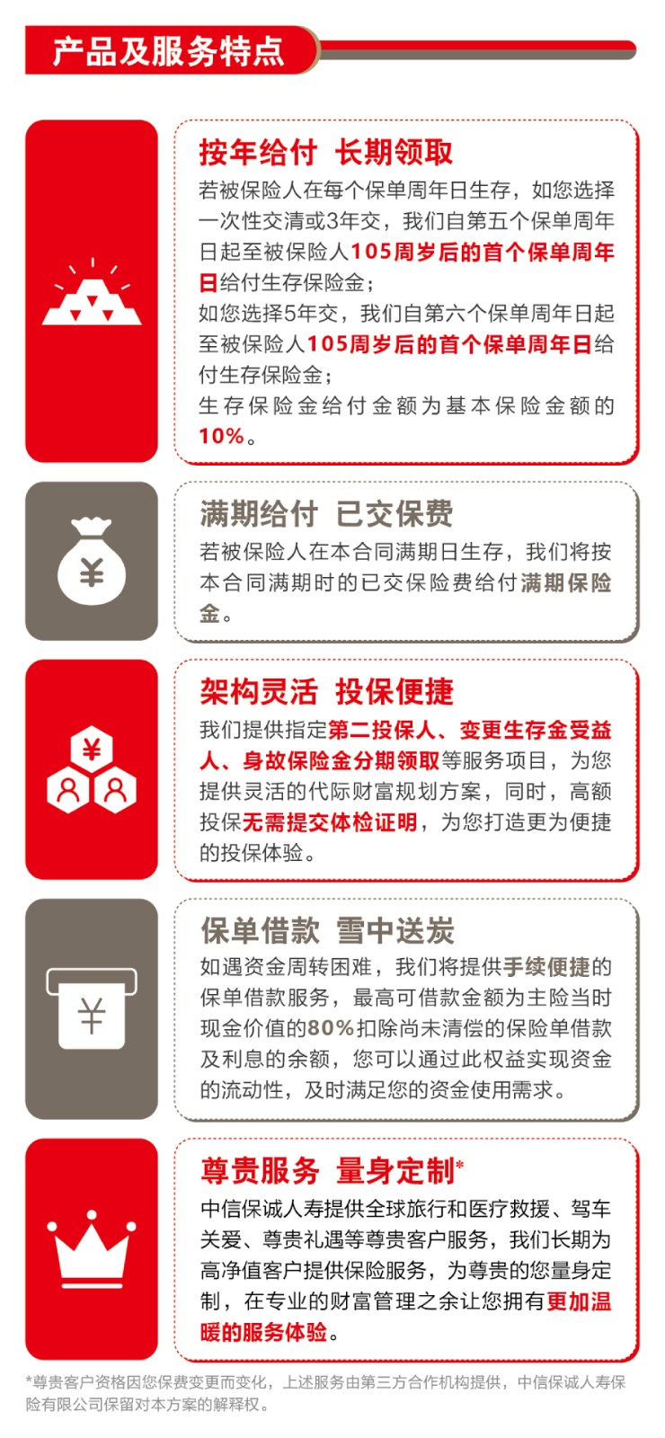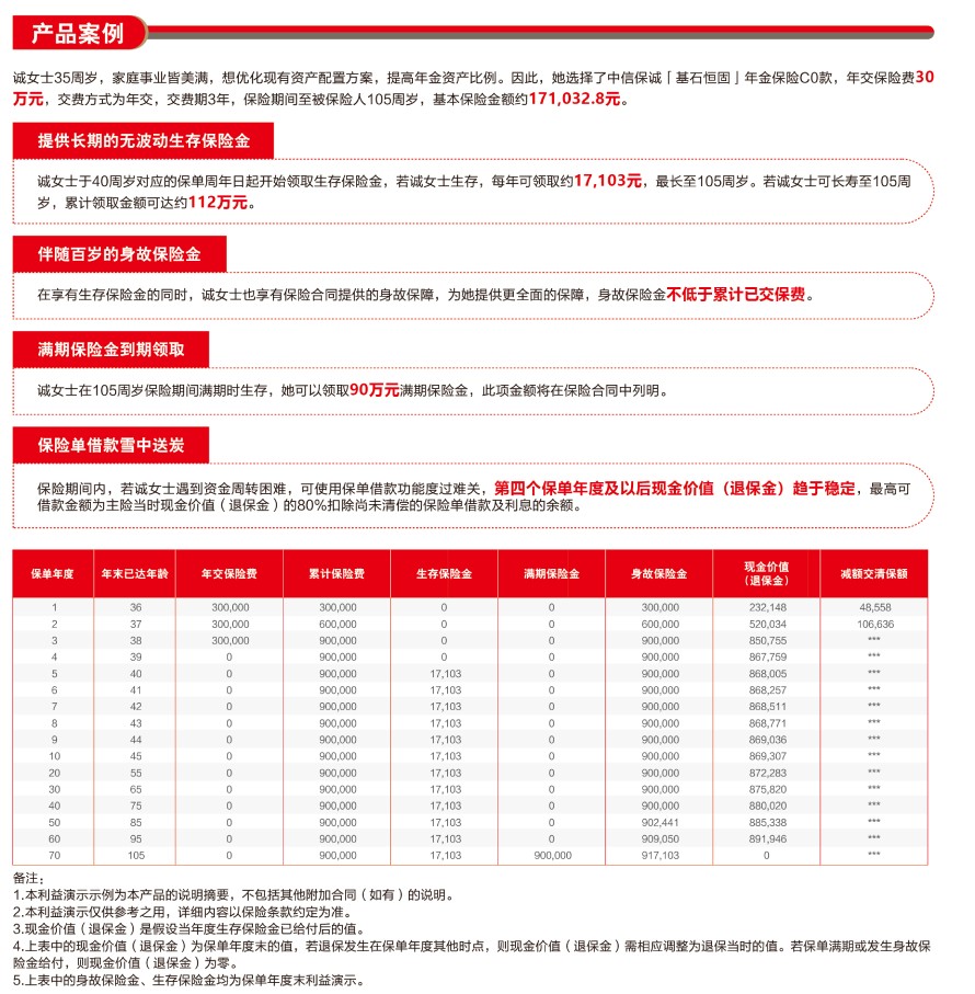 责任免除:在某些情况下,我们不承担保险责任,详细内容见相关保险合同条款。此为产品的简单介绍,仅供参考,详细内容请以保险合同条款为准。相关保险合同条款:中信保诚「基石恒固」年金保险C0款