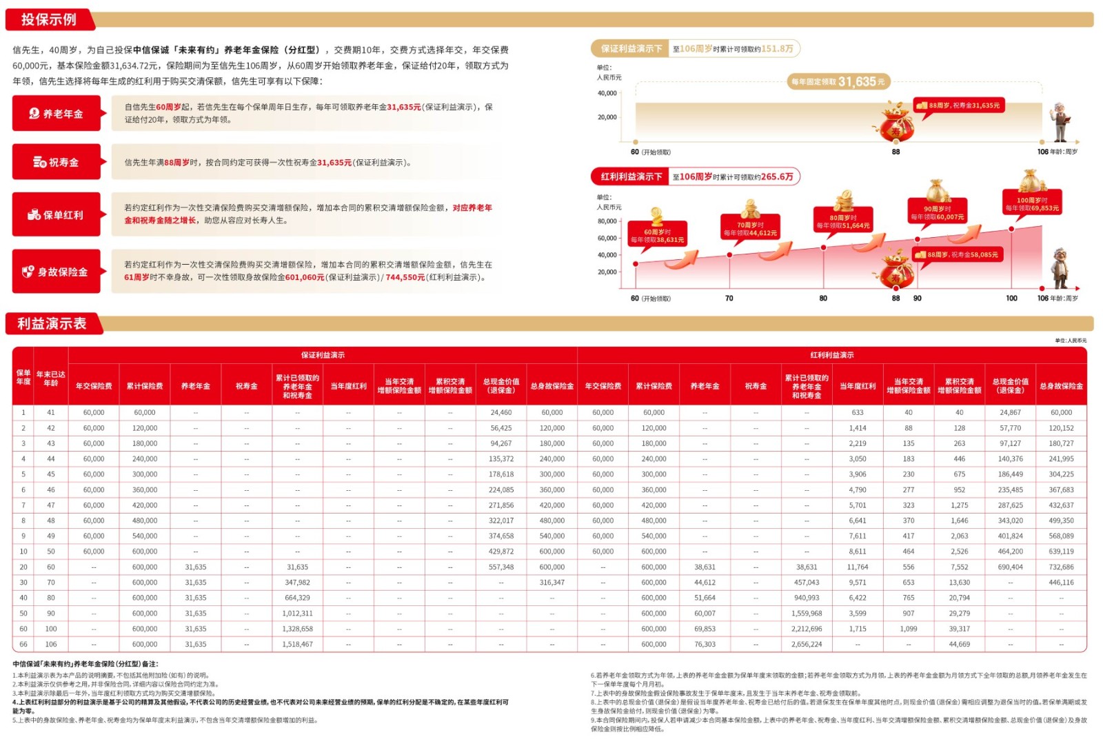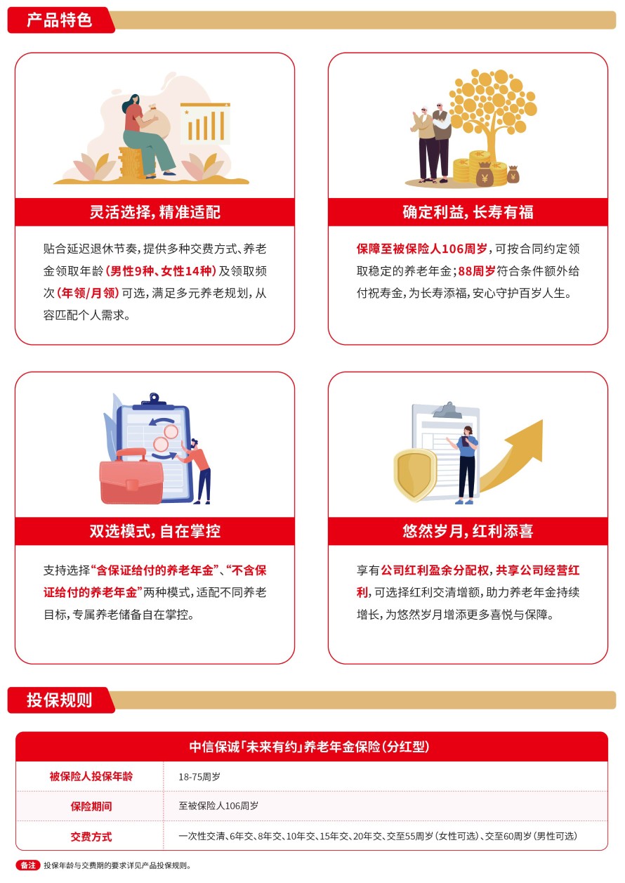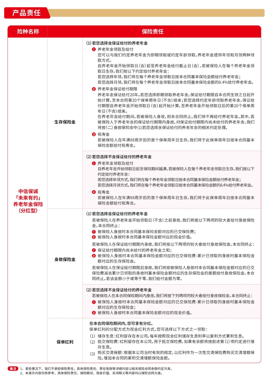 责任免除:在某些情况下,我们不承担保险责任,详细内容见相关保险合同条款。此为产品的简单介绍,仅供参考,详细内容请以保险合同条款为准。相关保险合同条款:中信保诚「未来有约」养老年金保险(分红型)