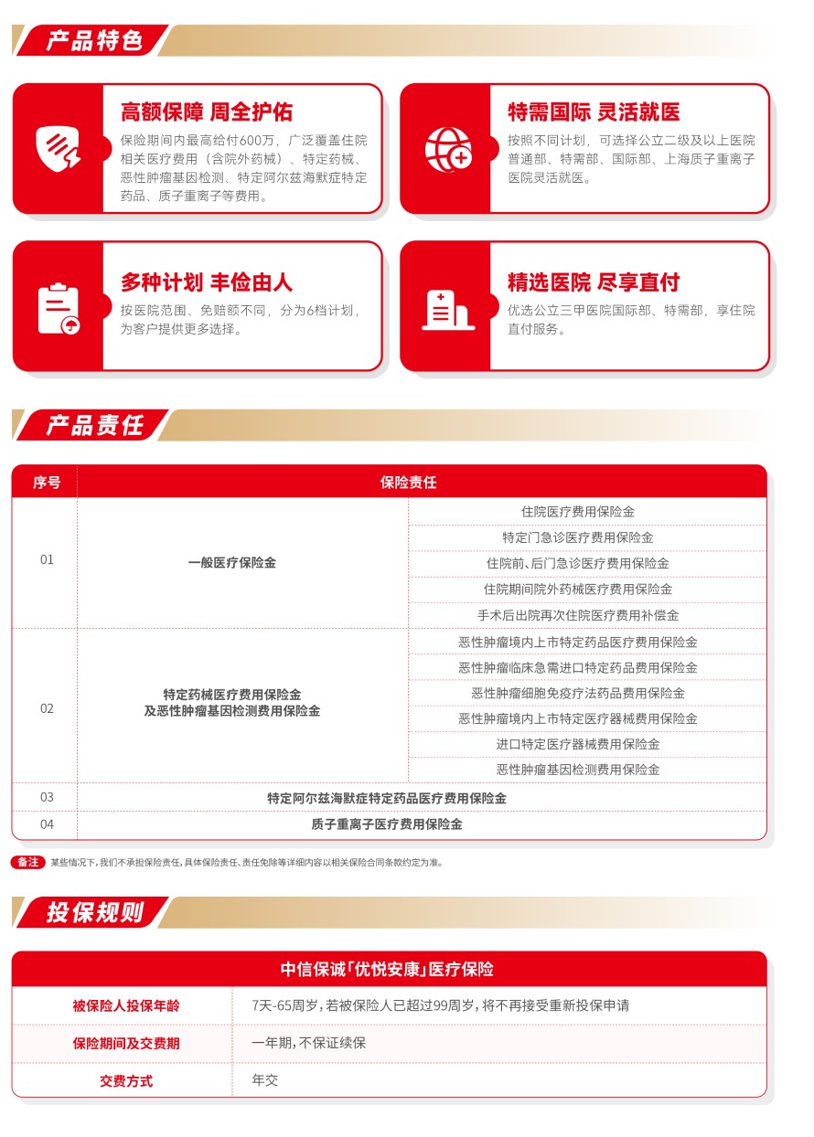 责任免除:在某些情况下,我们不承担保险责任,详细内容见相关保险合同条款。此为产品的简单介绍,仅供参考,详细内容请以保险合同条款为准。相关保险合同条款:中信保诚「优悦安康」医疗保险